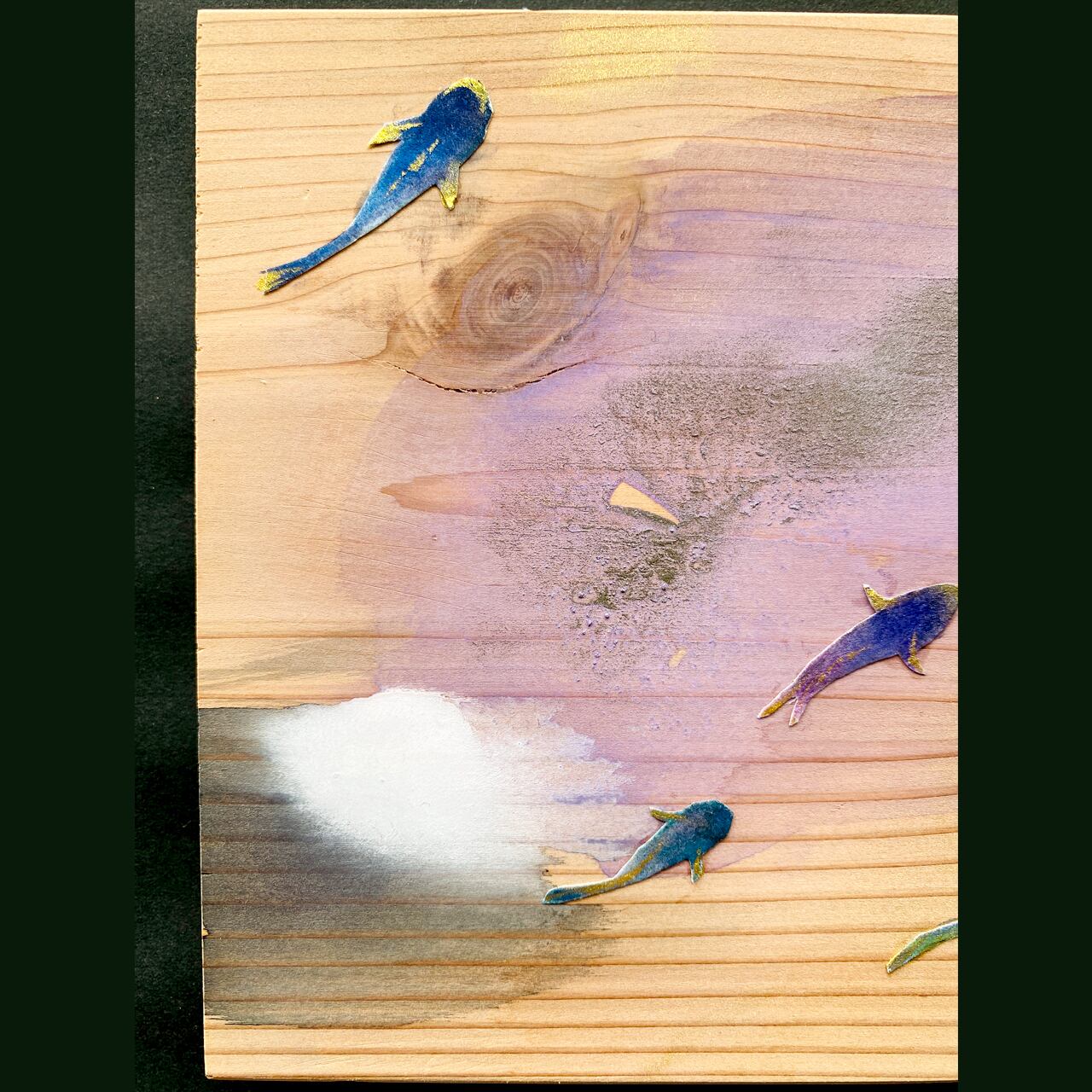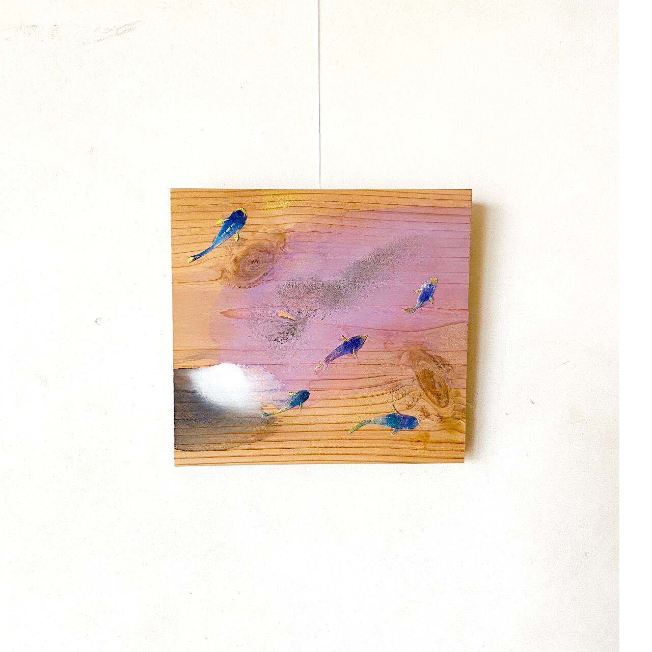 岩絵の具の漂うような粒子感や、角度によって表情を変える自然素材の豊かな作品です。