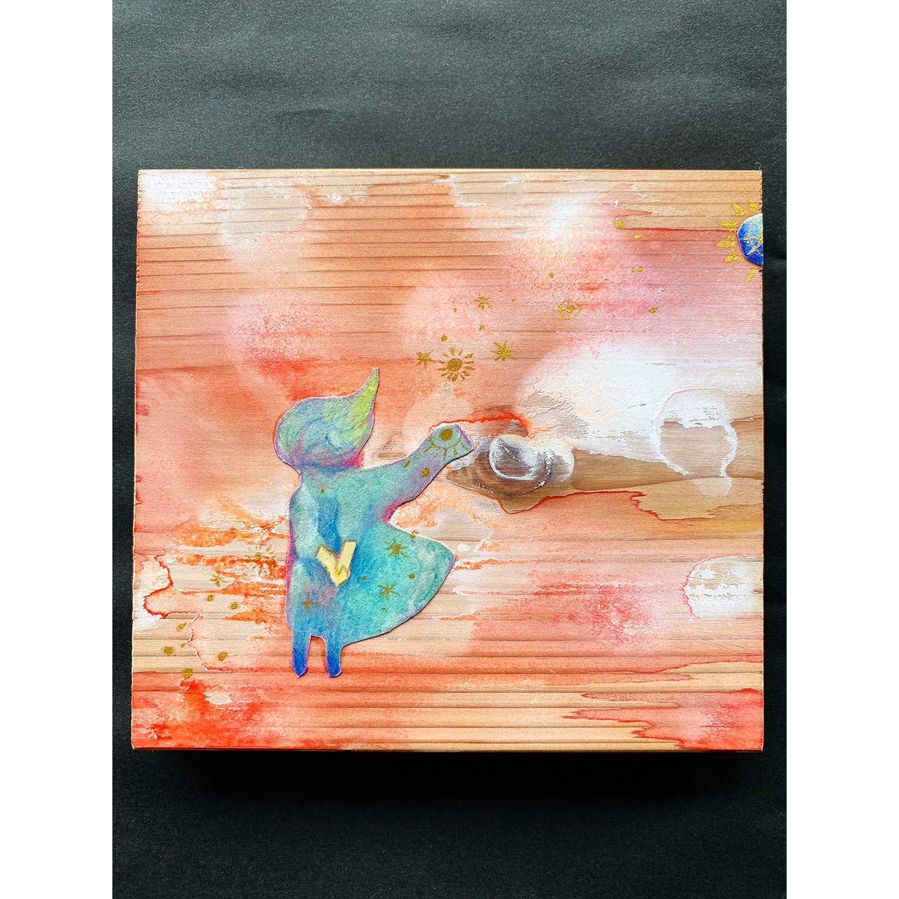 岩絵の具の漂うような粒子感や、角度によって表情を変える自然素材の豊かな作品です。