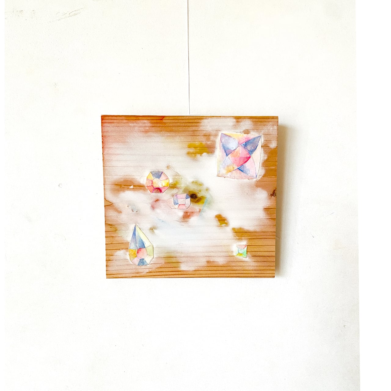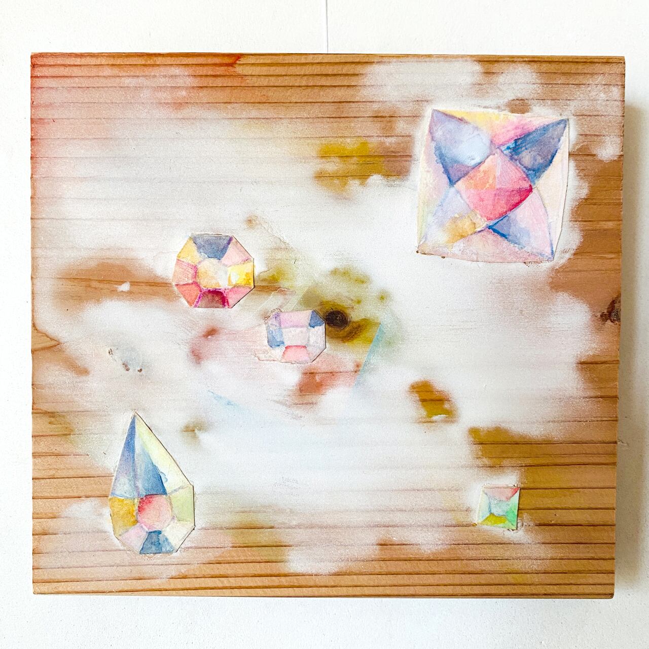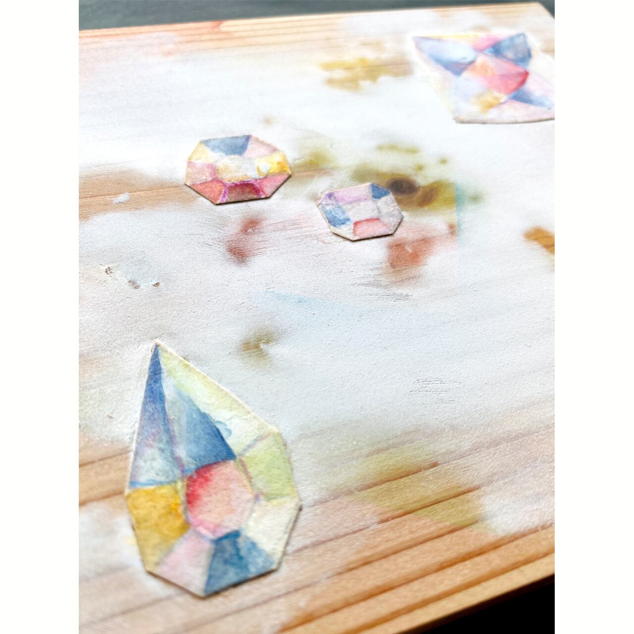 岩絵の具の漂うような粒子感や、角度によって表情を変える自然素材の豊かな作品です。
