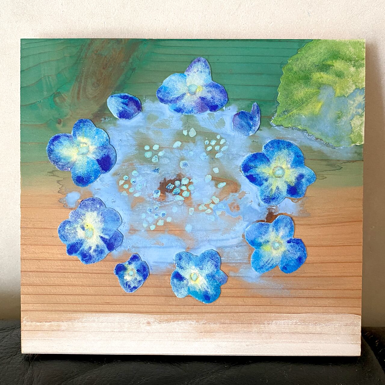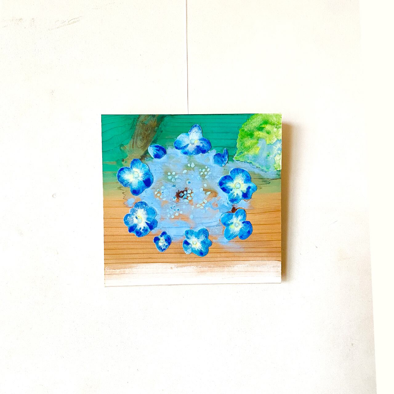 岩絵の具の漂うような粒子感や、角度によって表情を変える自然素材の豊かな作品です。