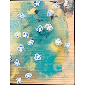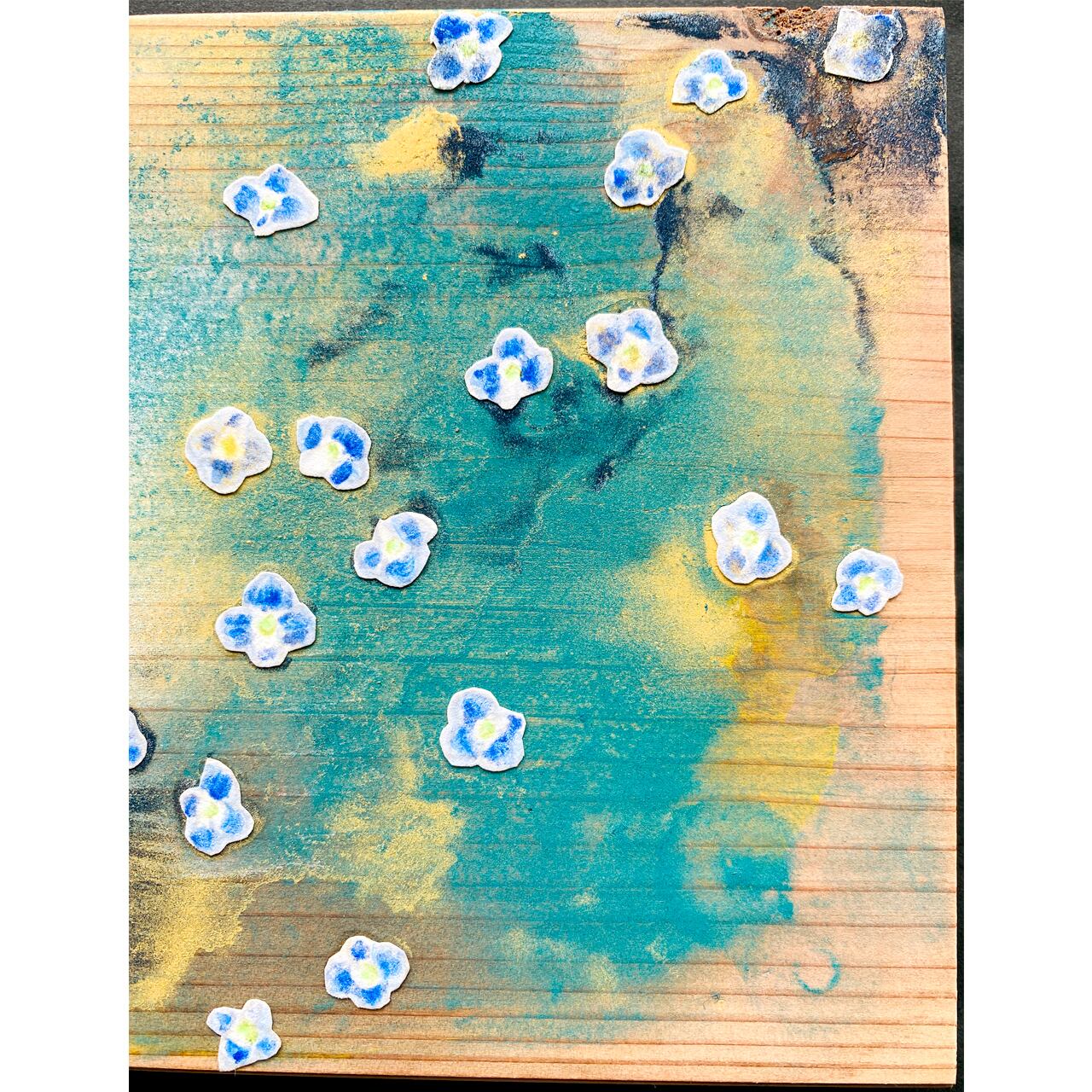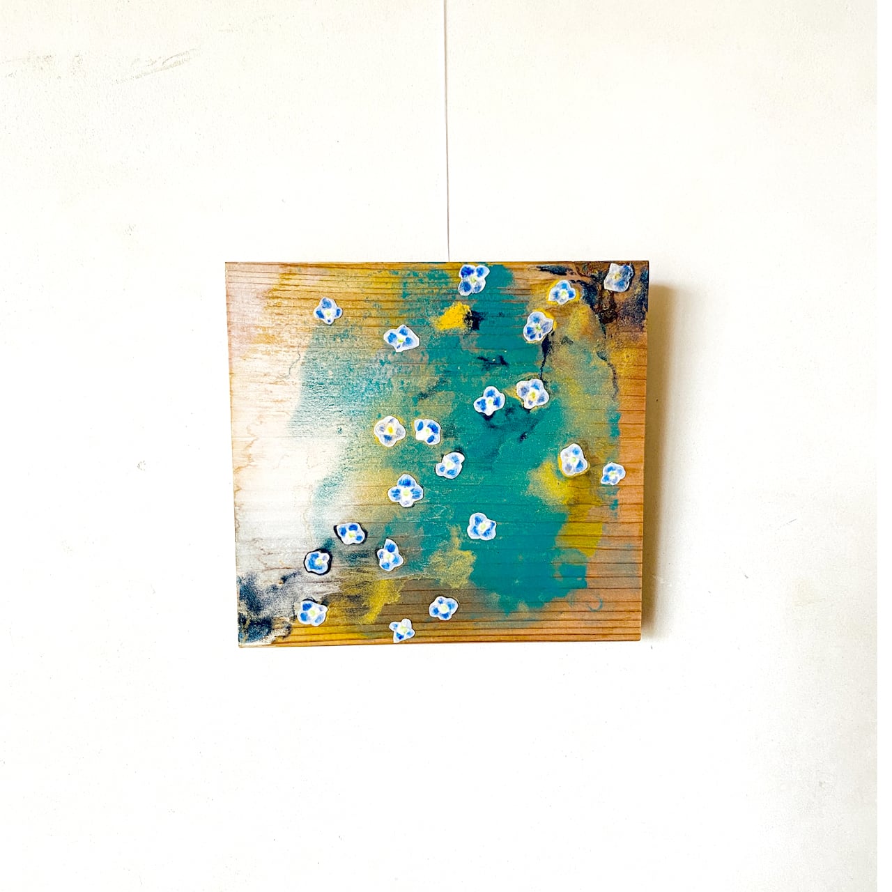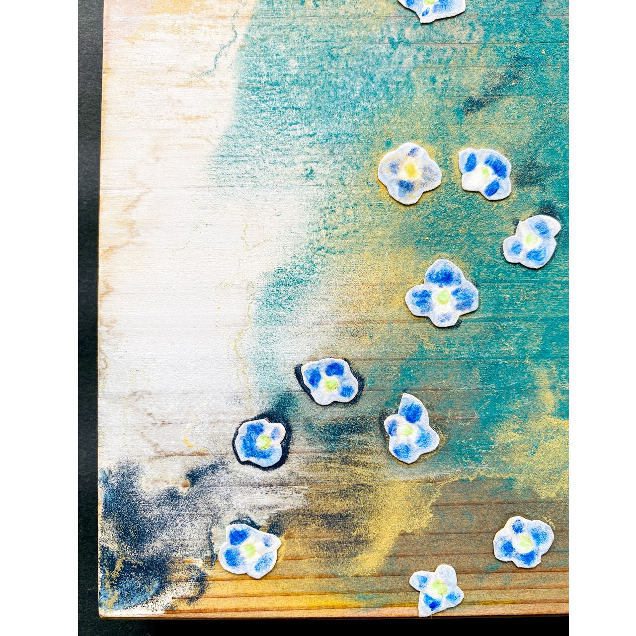 岩絵の具の漂うような粒子感や、角度によって表情を変える自然素材の豊かな作品です。