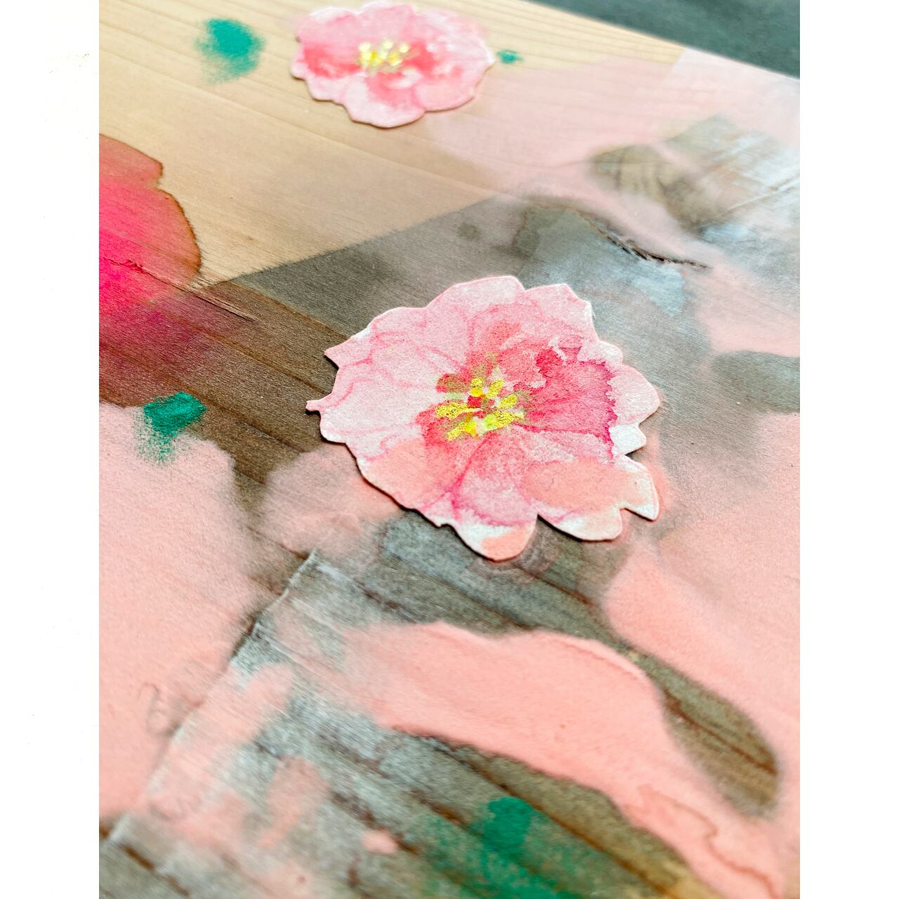 岩絵の具の漂うような粒子感や、角度によって表情を変える自然素材の豊かな作品です。