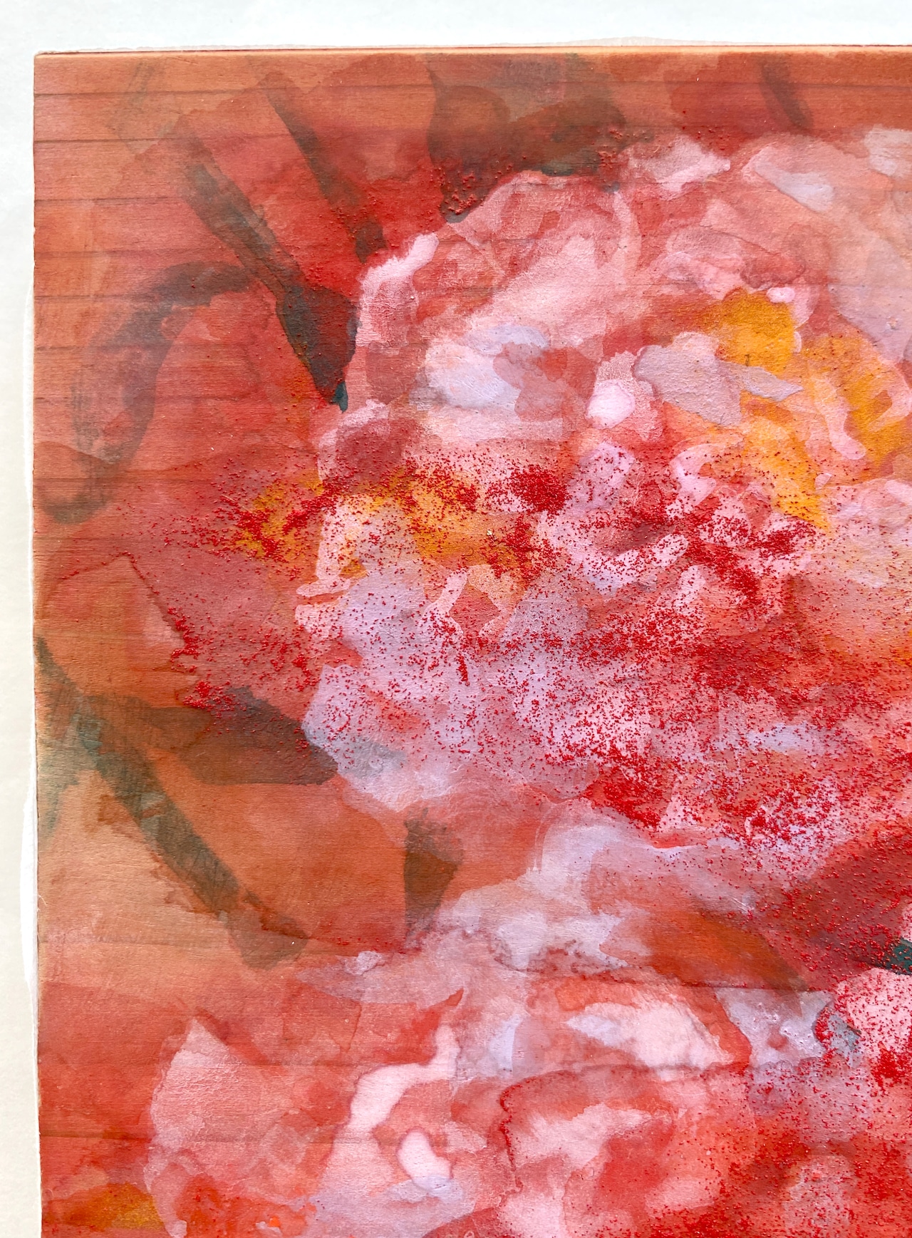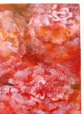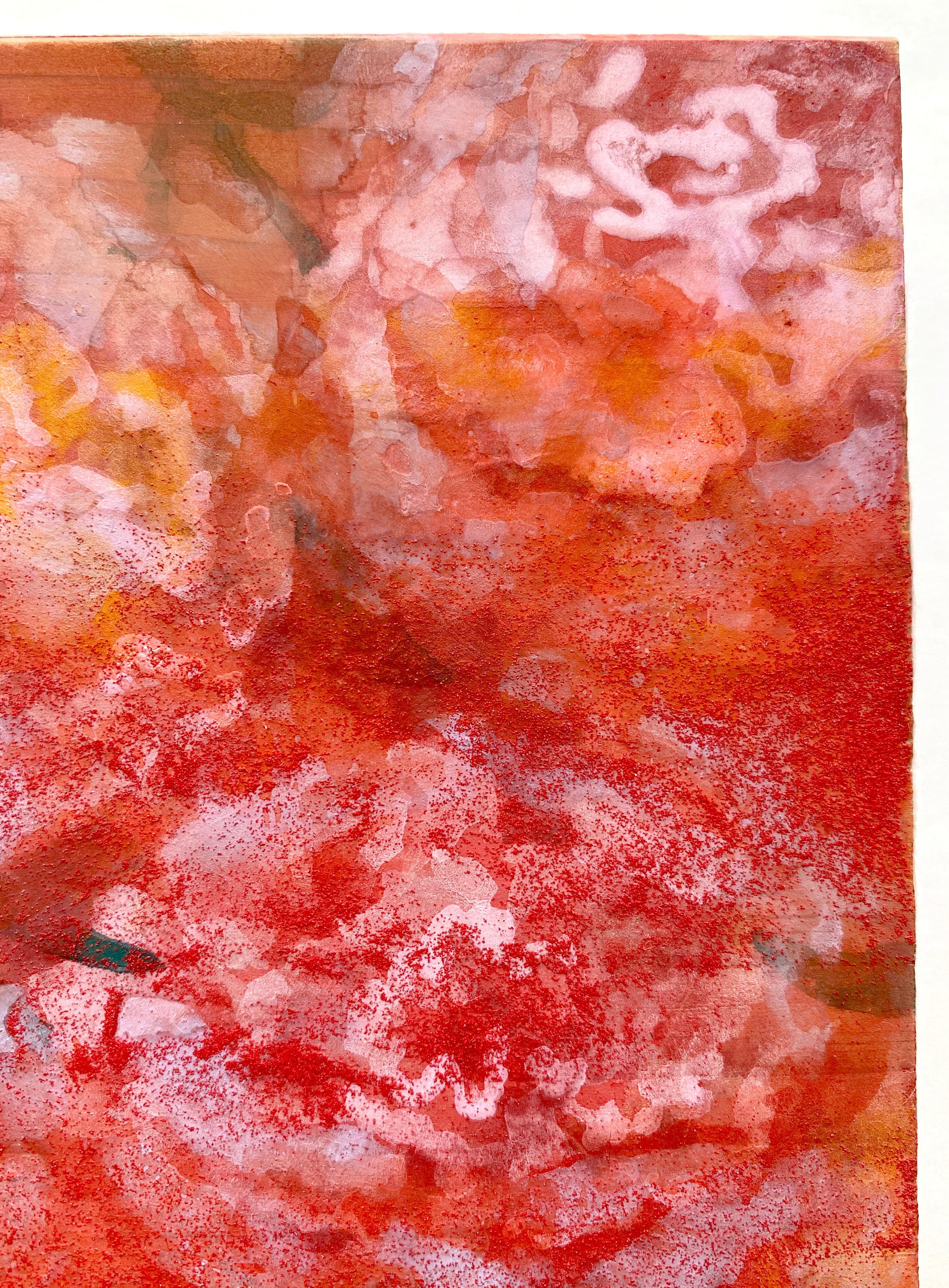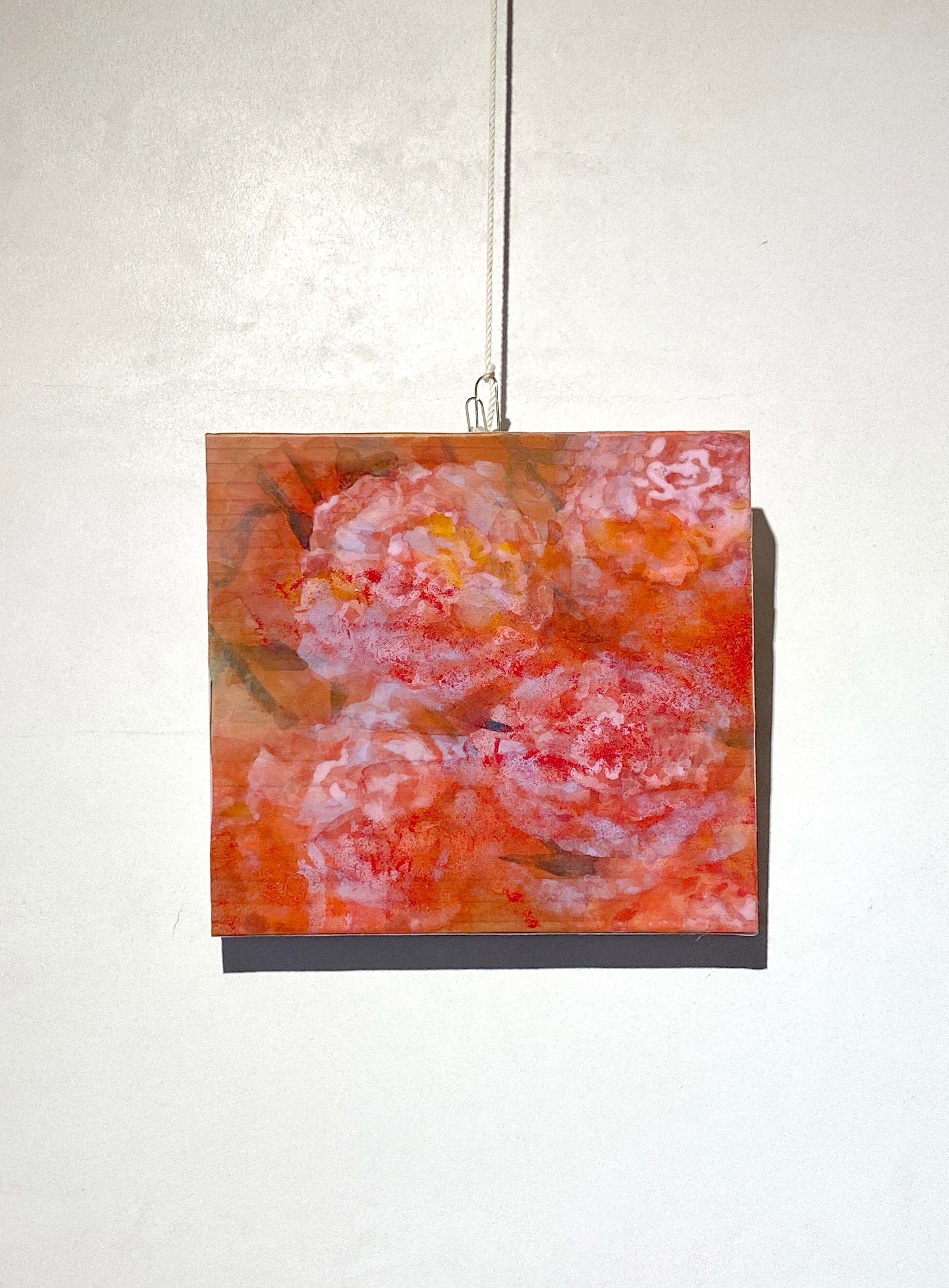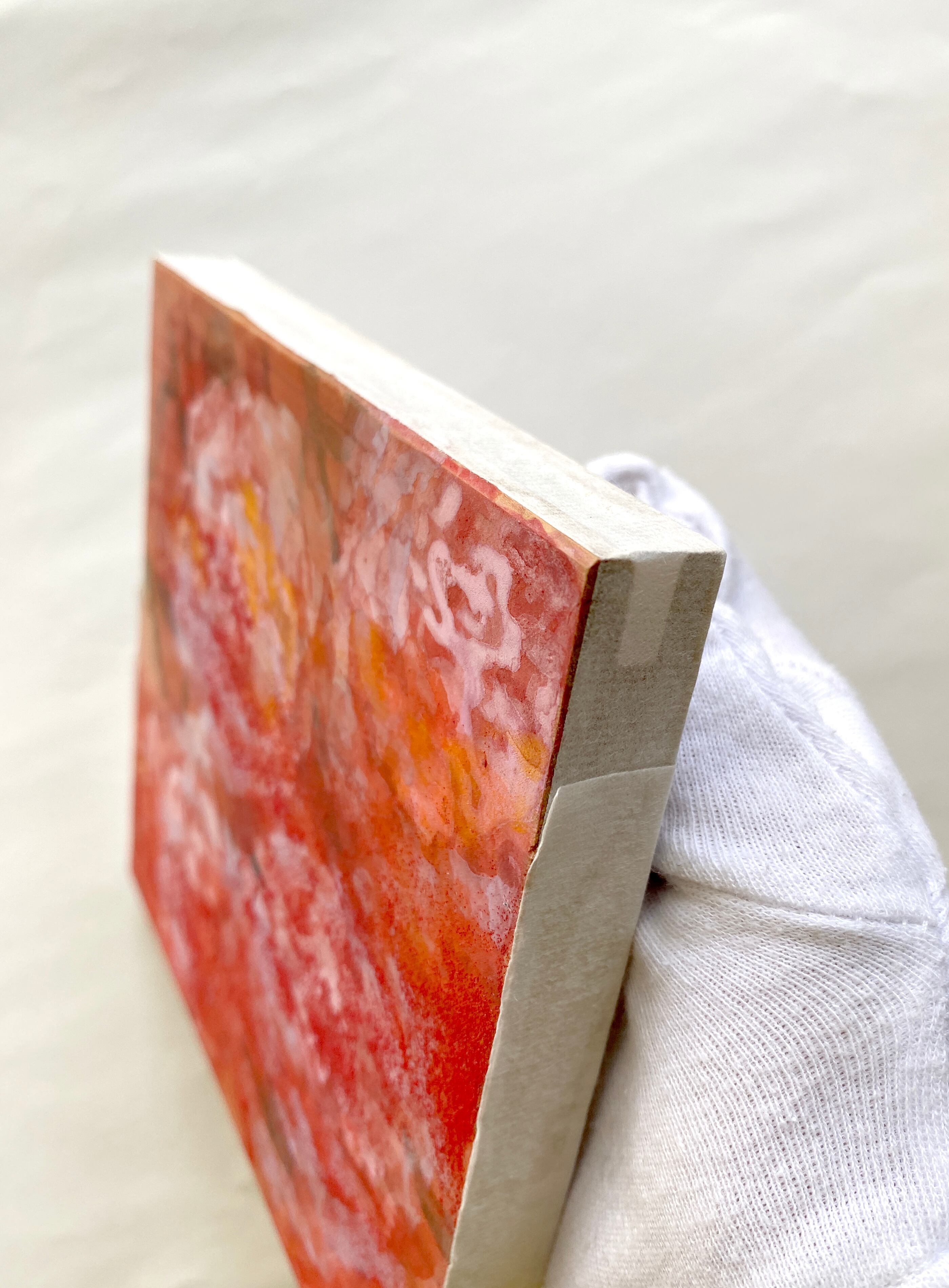 岩絵の具の漂うような粒子感や、角度によって表情を変える自然素材の豊かな作品です。